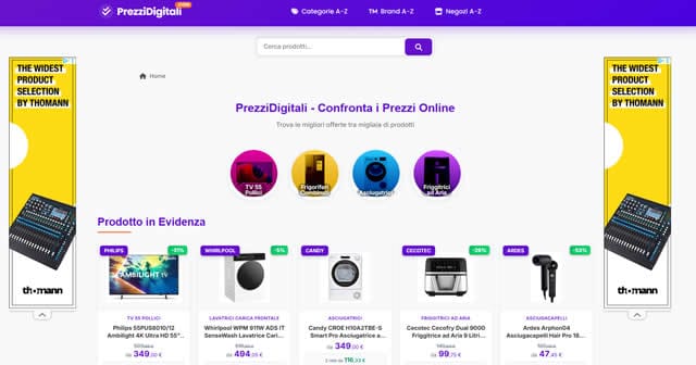 Prezzi Digitali (da non confondere con Prezzo Digitale che è un store online) è un comparatore prezzi di elettrodomestici in gradi di offrirti il prezzo più basso di decine di negozi di elettrodomestici online. La sua grafica è molto carina e ti consente di poter trovare la tua asciugatrice delle migliori marche tra cui: Electrolux, Beko, Bosch, Candy, Samsung e tante altre al miglior prezzo. In pratica invece di cercare su ogni store online l’elettrodomestico che vuoi acquistare e quindi confrontare il prezzo, con un click hai a disposizione tutte le offerte più interessanti.