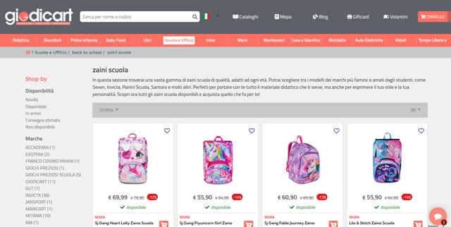 Giodicart.it è uno dei migliori siti dove acquistare online zaini per la scuola. Dall’asilo alle elementari e medie fino agli zaini per ragazzi, sono disponibili soluzioni adatte a ogni esigenza. Giodicart offre tutto il necessario per il Back to School, dal materiale per i più piccoli ai più grandi: zaini, astucci, diari, cancelleria e molto altro. Tra le proposte figurano i migliori brand come Seven, Invicta, Eastpak, Giochi Preziosi. Il catalogo include le ultime tendenze del momento, con i personaggi più amati dai bambini nelle linee Lilo & Stitch, SJ Gang, Paw Patrol, Frozen per i più piccoli, ma anche i classici intramontabili come Spiderman, Pokémon, Minnie e molti altri.