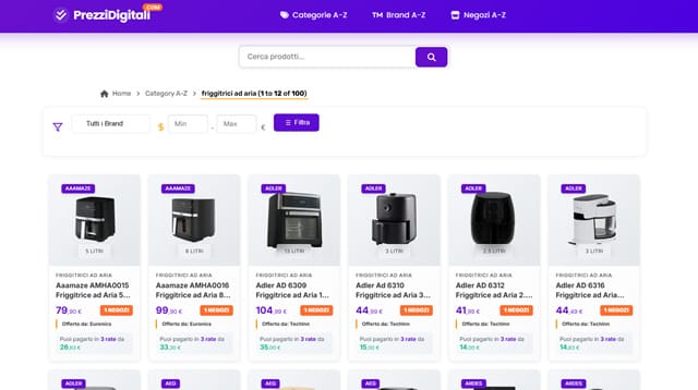 PrezziDigitali.com è un punto di riferimento per chi vuole acquistare grandi e piccoli elettrodomestici online ed è affidabile perché al suo interno è possibile trovare venditori seri e tra i più apprezzati online. Essendo un sito di confronto prezzi, non vende direttamente la merce esposta ma, ti indica per lo stesso prodotto, il prezzo che puoi pagarlo in rete e molto spesso è possibile risparmiare veramente tanto. Ti consigliamo di dare un occhiata su Prezzi Digitali se stai cercando friggitrici ad aria.